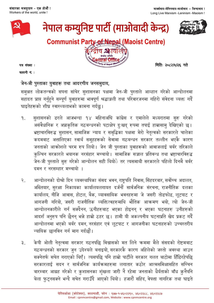 जेन जी पुस्ताका युवाहरूको आवाजलाई बर्बर तरिकाले कुल्चिन सरकारले भयानक नरसंहार मच्चाएको उनको आरोप छ । ‘सामाजिक सञ्जाल प्रतिबन्ध तथा भ्रष्टाचारविरुद्ध जेनजी पुस्ताले सुरु गरेको आन्दोलन सही थियो तर त्यसमाथि सरकारले पहिलो दिनमै बर्बर दमन र नरसम्हार मच्चायो’ प्रचण्डले भने ।